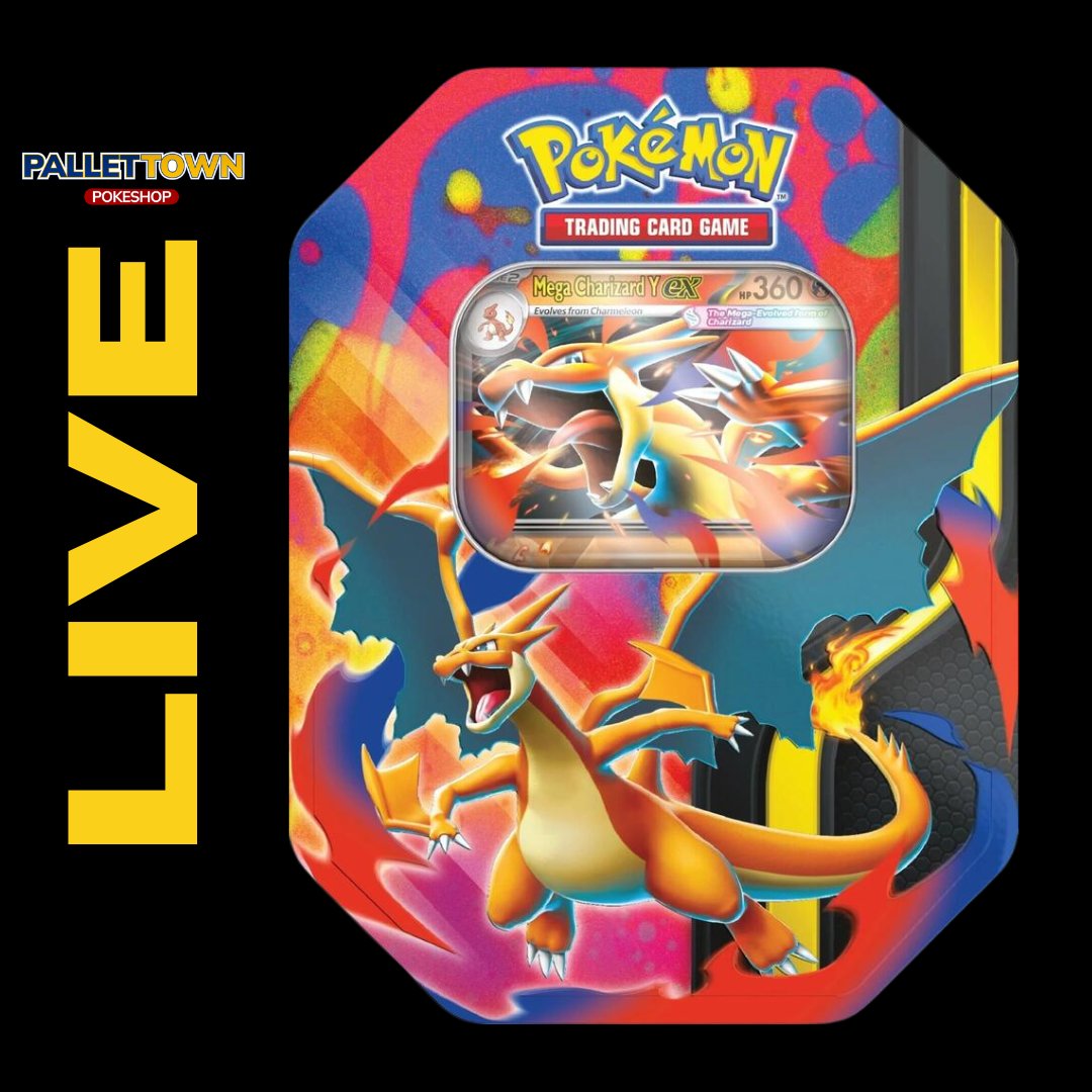The Pokémon TCG: Mega Charizard Tin includes: • 1 foil promo card featuring Mega Charizard X ex or Mega Charizard Y ex • 4 Pokémon TCG booster packs • A code card for Pokémon TCG Live